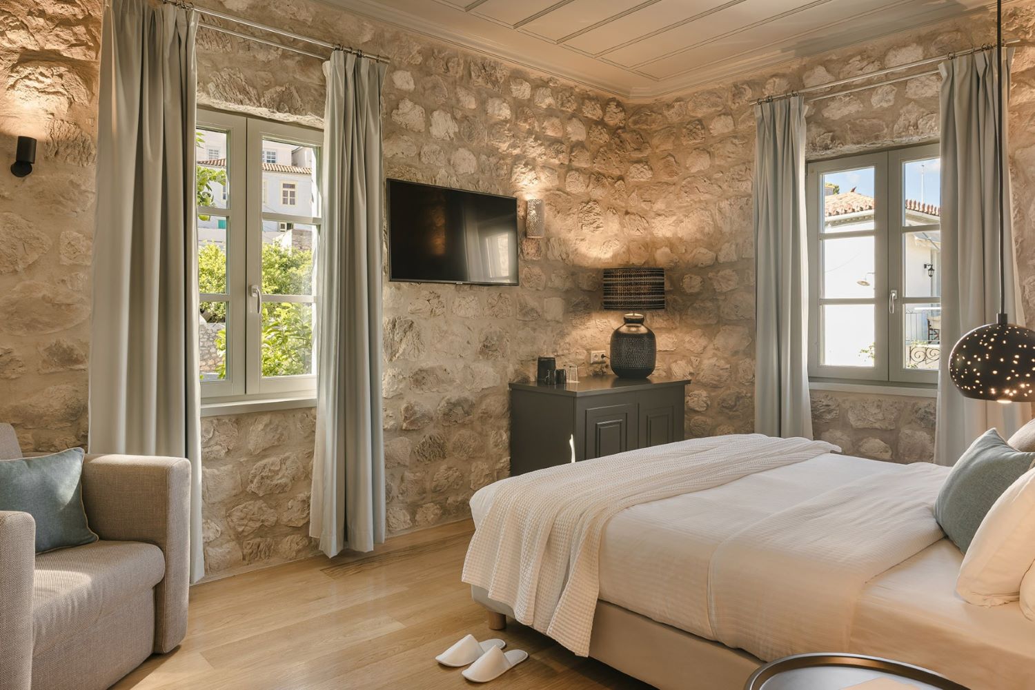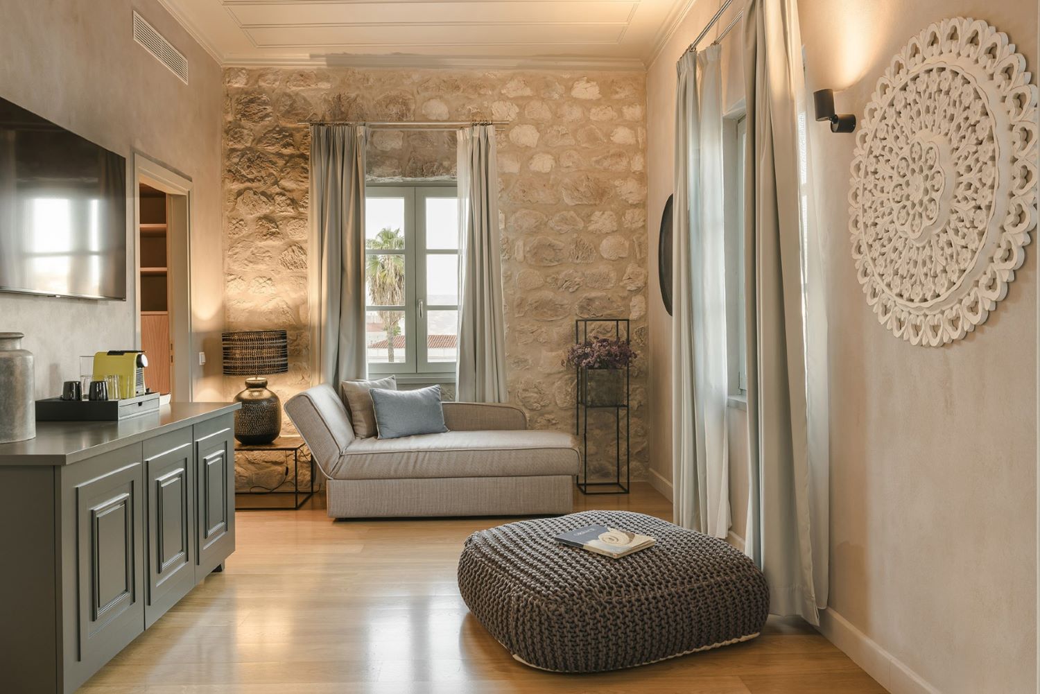 Junior suite (35sqm) is suitable for a family with a maximum capacity of up to 2 people and 1 child. It boasts views from all 3 sides facing Votsi Square and has a double bed and a sofa bed. The bathroom is lined with marble and features a bathtub.