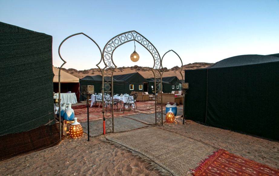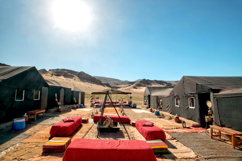 After a welcoming traditional glass or two of mint tea, your dinner will be served. This night may be spent in your tents or out in the open air under the awesome canopy of the starlit heavens around a blazing fire to witness the magnificent sunset, the rarefied heavens turning from bright blue to cobalt, to yellow to gold, to purple to black (the sands and stones change their colour too, in step with the lowering rays). Enjoy a convivial atmosphere around the fire to the sound of Sahraoui folklore.
