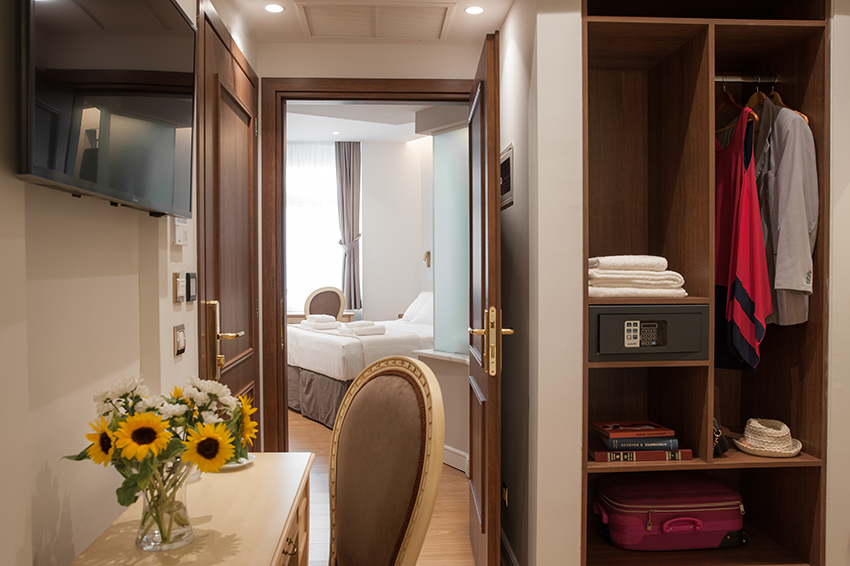 All rooms are en suite with shower and air conditioning/heating, satellite LCD TV, MP3 player, soundproofed windows, free mini bar (soft drinks, mineral water, beers, snack & chocolate etc.), free wifi access, mini fridge, free bottle of water upon arrival, safety deposit box, hairdryer. Rooms are a mixture of: