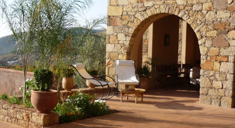 The Kasbah Tizouit is a guest house in the heart of Berber country, in a valley cut by seguias (irrigation channels) and crops, between almond trees, pomegranate trees and olive trees. The house itself is built on the hillside.