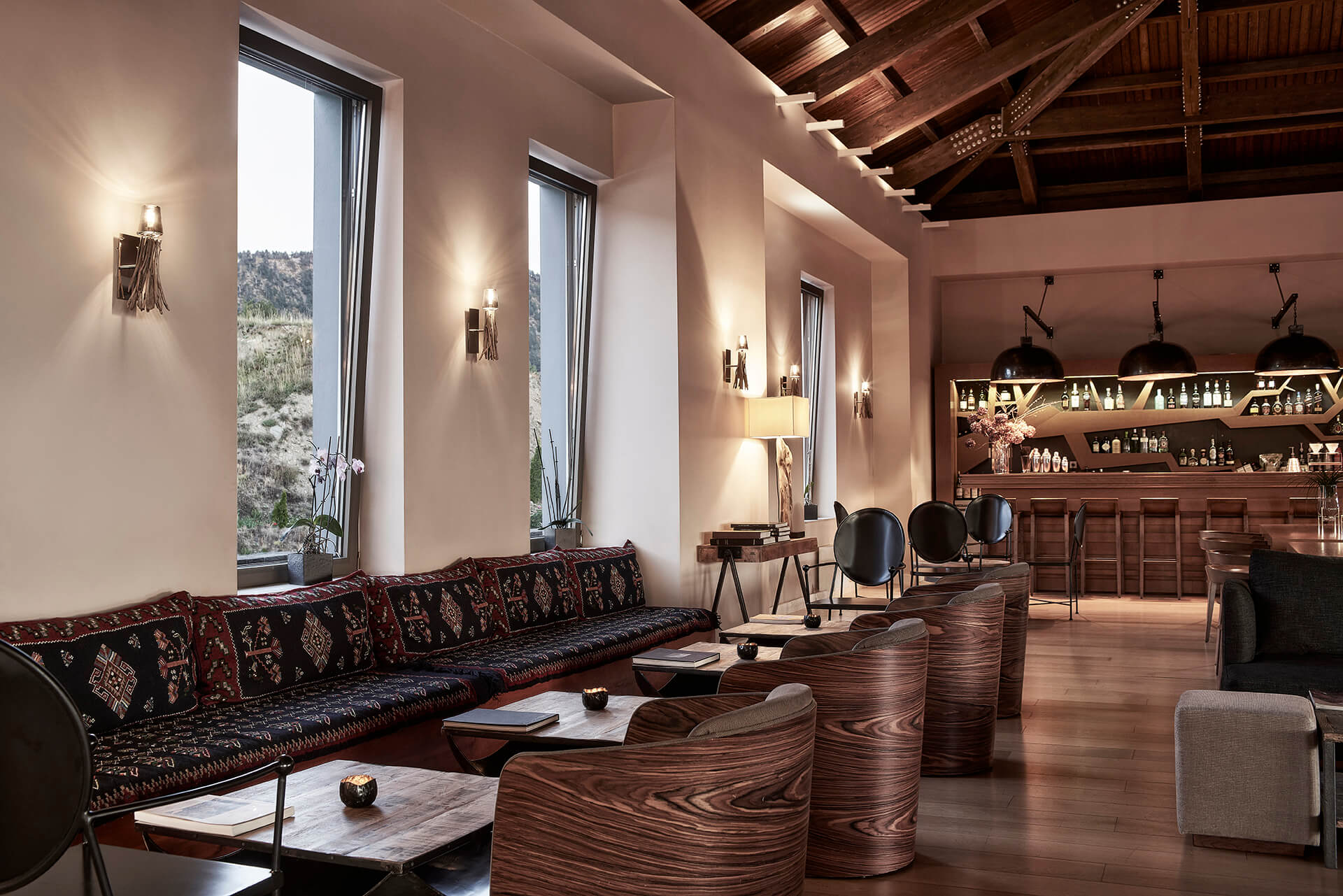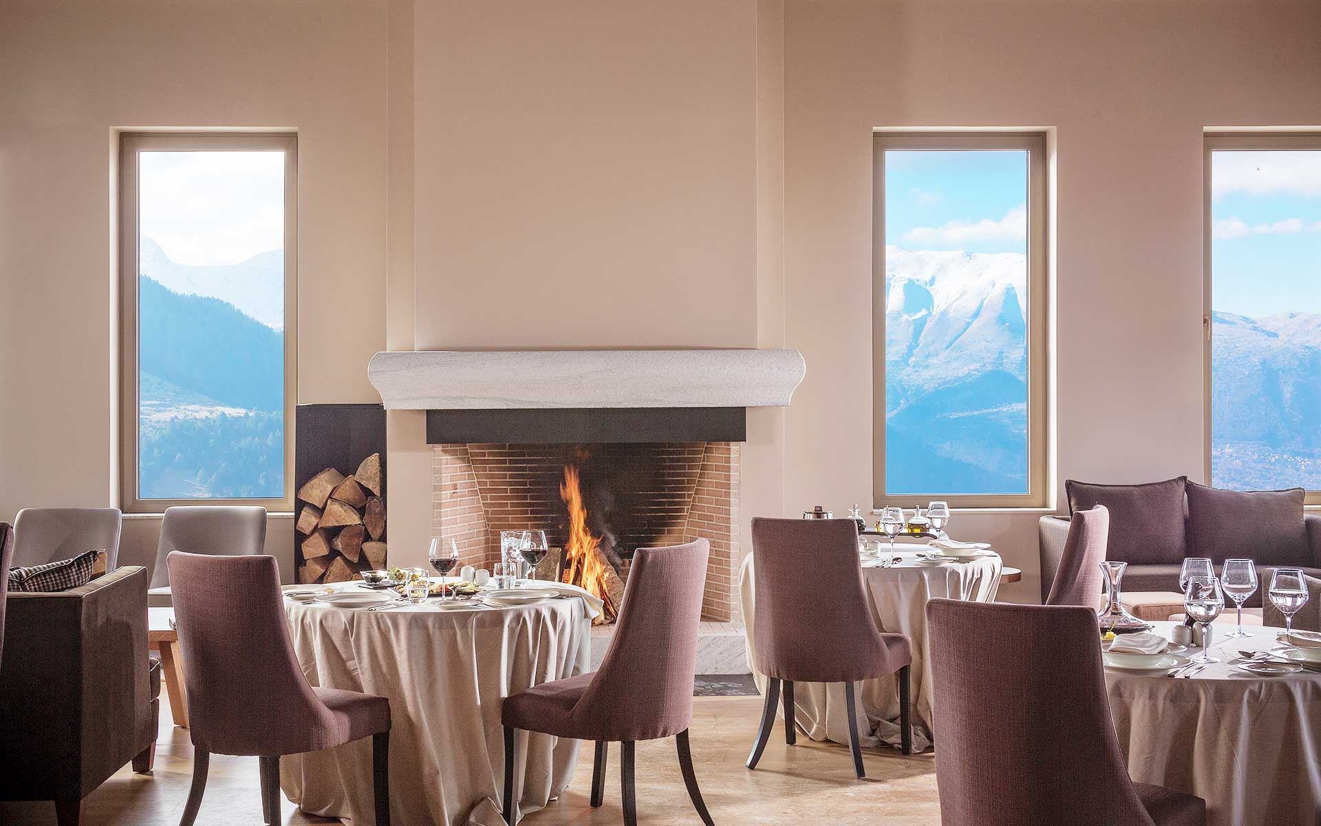 Reception; Restaurant Metsovo 1350m; lobby area with central fireplace; Pines private lounge & bar; Fontus Spa with beauty salon, sauna*, Jacuzzi* & hammam*, heated hydrotherapy tank; infinity pool (June- August); gift shop; gym; children’s area.