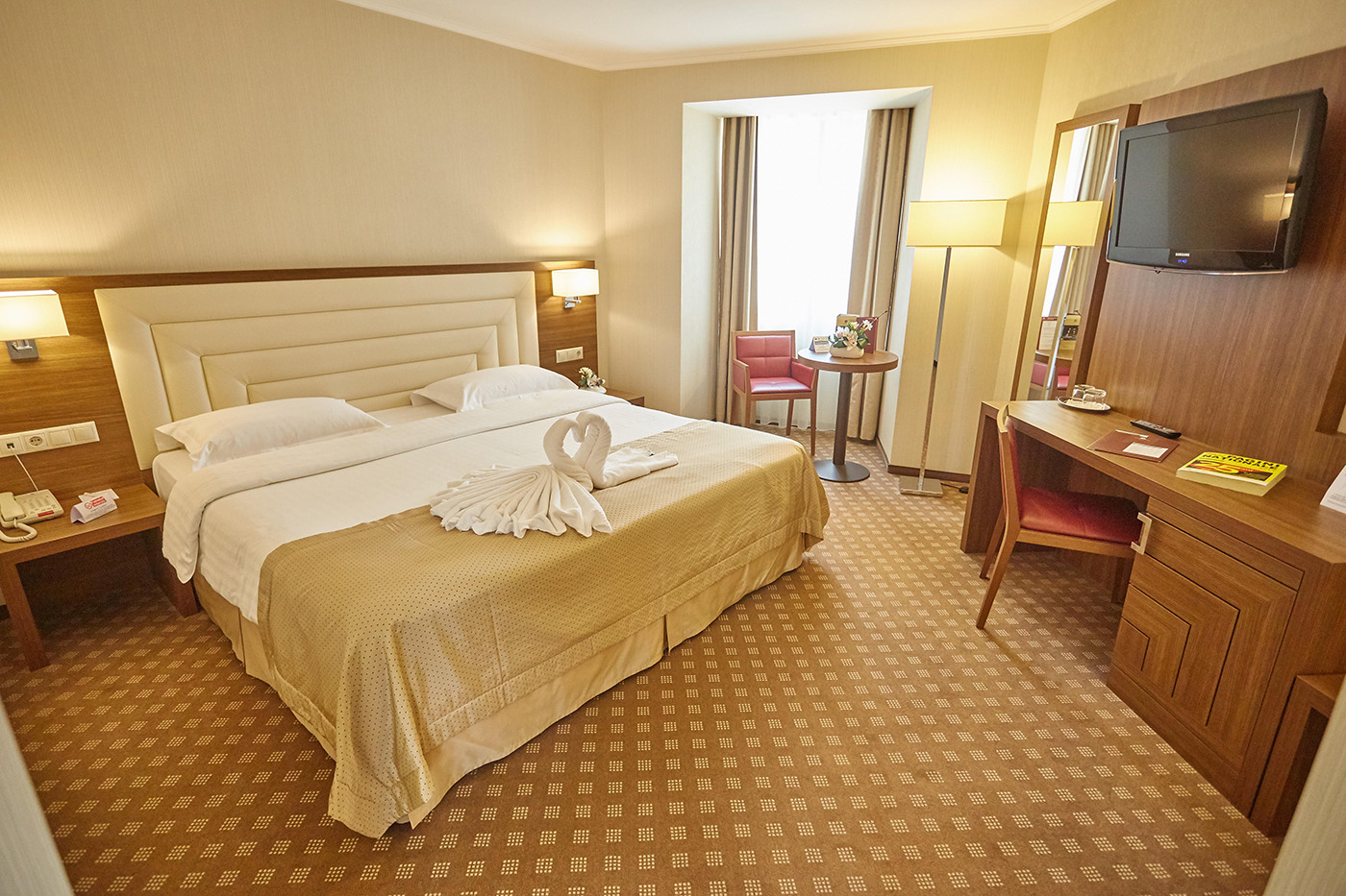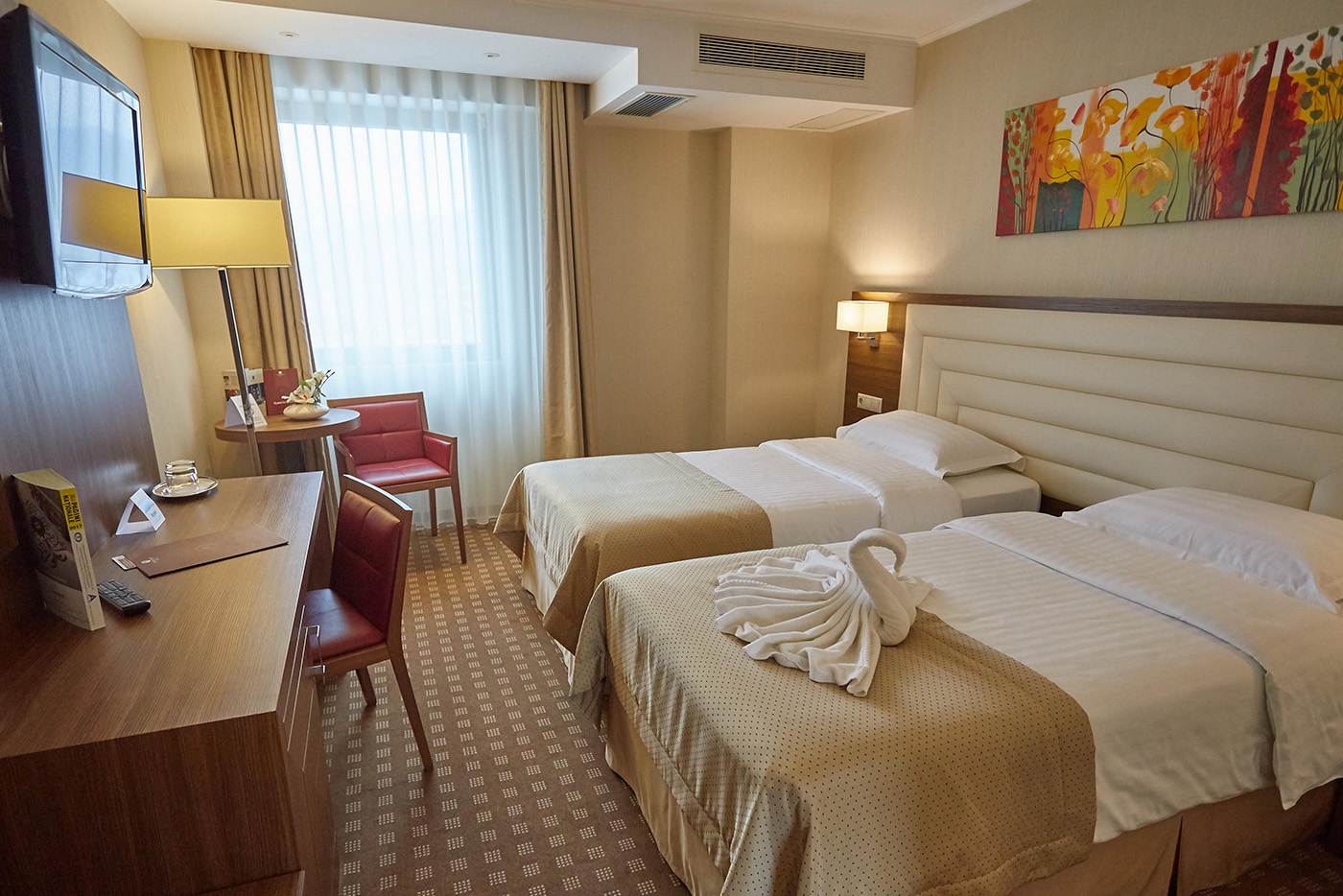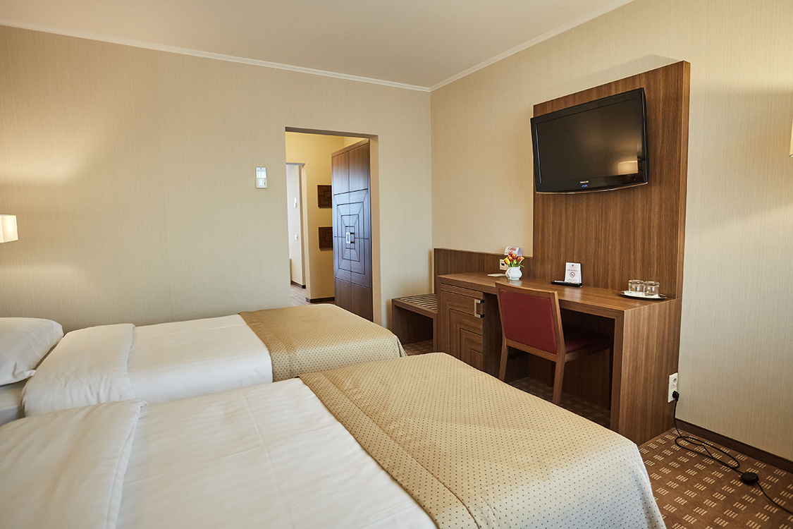 155 elegant rooms, decorated in a contemporary modern style, in warm colours that provide harmony, comfort and freshness. All rooms are equipped with free internet access, electronic door lock system, satellite TV, individually controlled air conditioning and heating, LCD TV, safety deposit box, minibar, telephone. Room types increase in size and facilities from Premier rooms to Superior rooms (city views); Junior Suites, Family Suites (interconnecting rooms), Senior Suites & two Presidental Suites (these are on the top floor). Senior and Presidential Suites have a Jacuzzi.