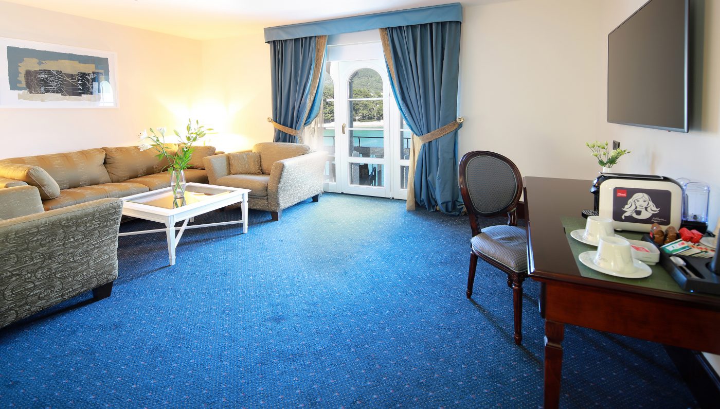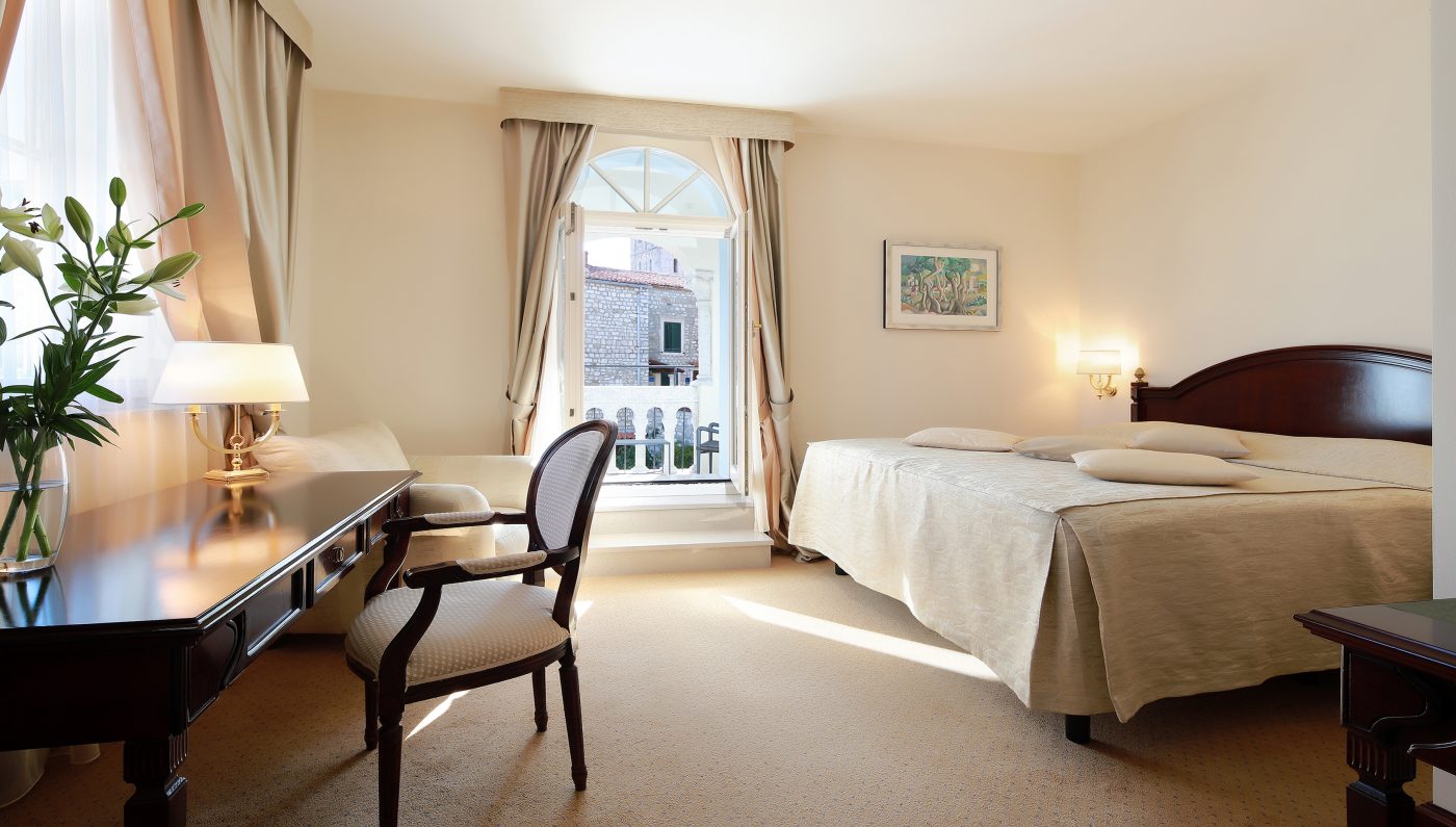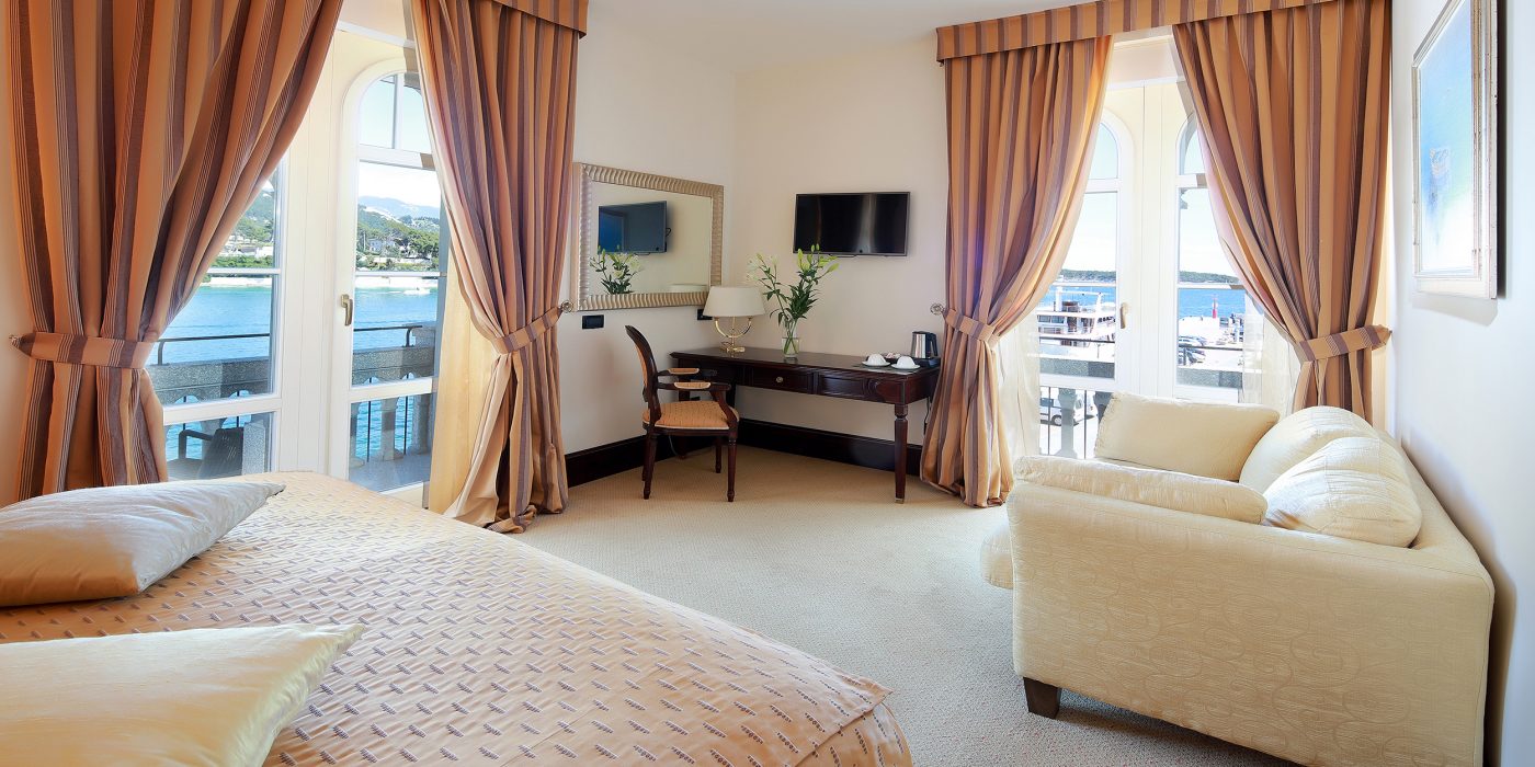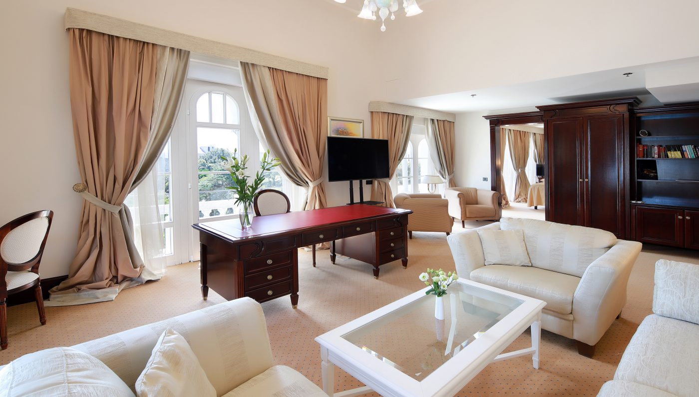 Presidential Suite is the ultimate in luxury. It consists of a living room with a desk and library, a spacious bedroom with a two-part bathroom, and a balcony offering a magnificent view of the sea and old town. Large balcony.